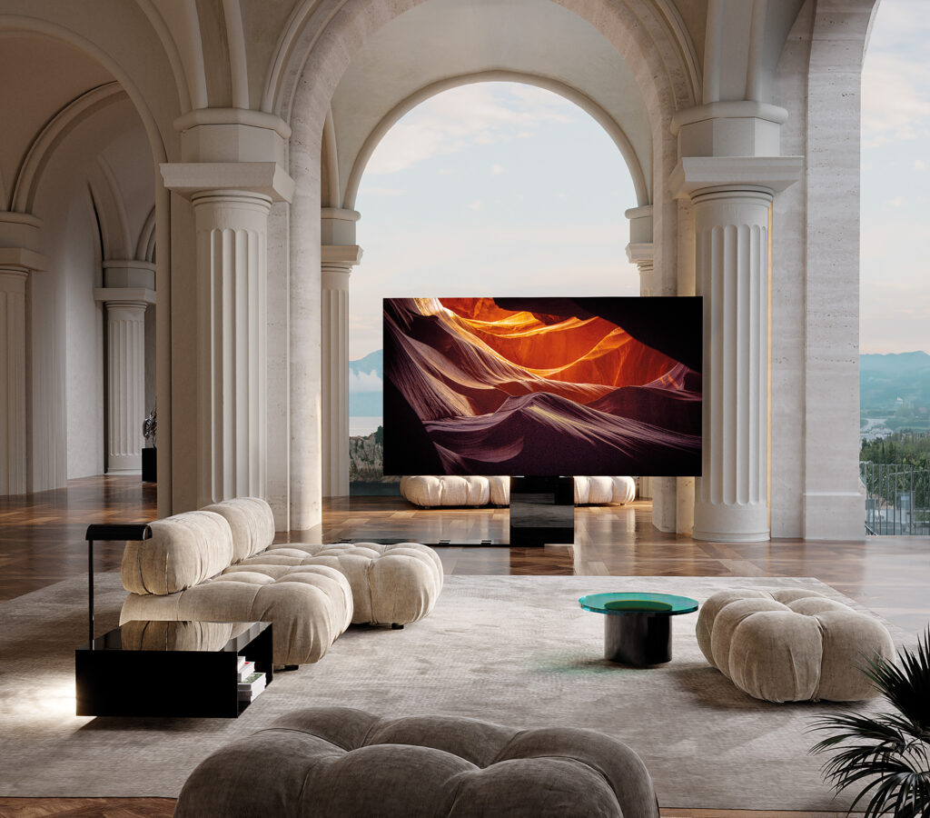 Promoted as “The petite model” on page 16 of their online PDF brochure, the elegant $XXX,XXX C SEED N1 Series 103 iNCH 4K MicroLED TV [C Seed link] is actually the smallest size television display they offer. It resembles a sleek, sophisticated console when closed, but at the push of a button, the screen comprised of five panels lifts and unfolds to a height of 70″ (or 5.8′) in 45 seconds.